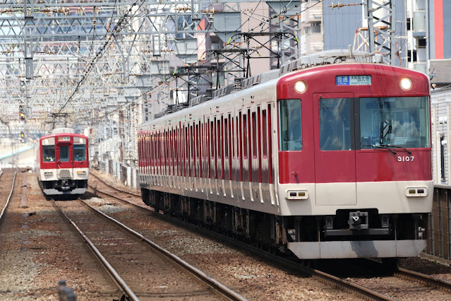3200系(3107F) 普通大和西大寺行き 更に続いて、難波発普通運用に就くKL07編成が同駅に接近。 隣の2番線に後から追いかける形で大阪線急行が迫ってきています。 |
