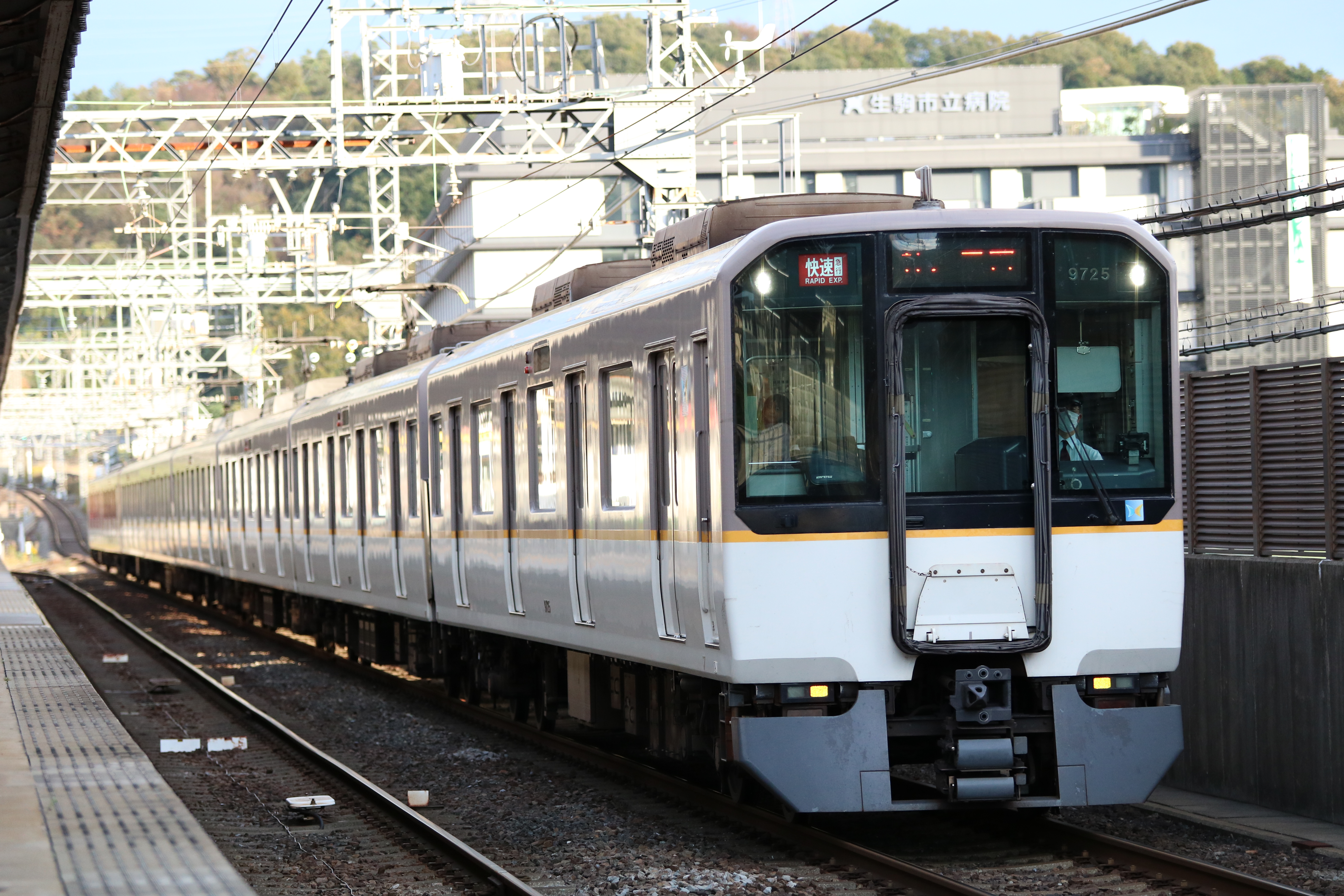 9820系(9725F) 快速急行神戸三宮行き 続いて、上り側をEH25編成を含む快急8両が同駅を通過。 こちらは、引き気味の画角(81mm)にて狙っています。 東生駒はそれ程望遠気味にしなくても通過列車を十分狙いますね。 |