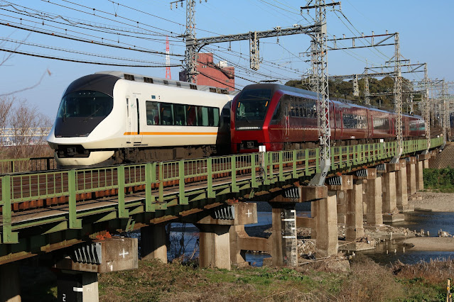 80000系ひのとり 名古屋行き 0308レ名阪甲特急 (その①) 河内国分駅から大和川橋梁(安堂第2号踏切付近)に到着後、撮影の準備を行っている所に、6両固定HV編成が接近。 そのタイミングで、上り乙運用の「Next」が橋梁に差し掛かったので、離合時を狙いまずは1枚。 |