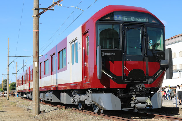 | 屋外展示車両③ そして、こちらは高安会場でのメインディッシュ、近鉄新型車両8A系の展示になります。 こちらは、10月初旬に陸送されたばかりの05編成になります。 前照灯も点灯、LED行先幕も表示状態になっています。 |